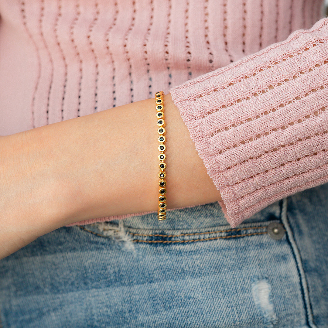 Discover the allure of the Black Gemstone Bracelet. Featuring black zircon stones set in a 14k gold-plated chain, this bracelet adds a subtle sparkle to any outfit.