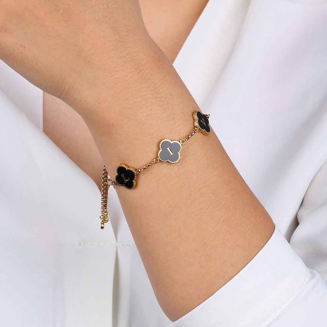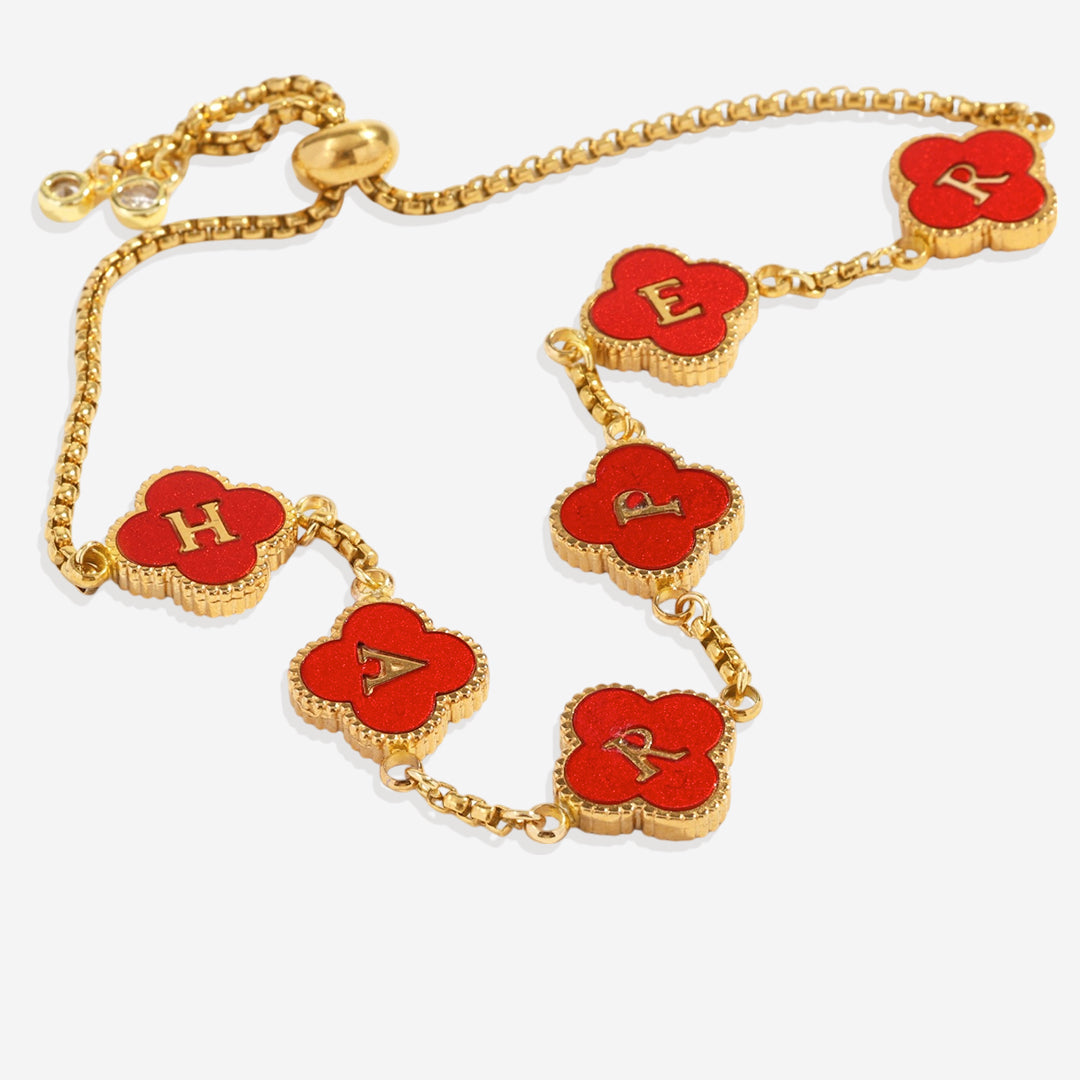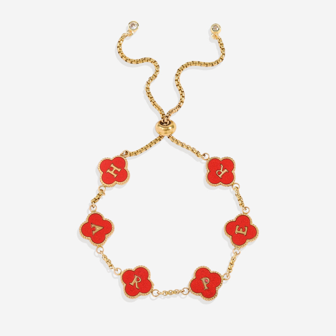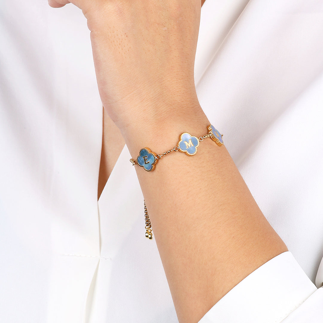 Add a playful touch to your look. This bracelet features vibrant clover charms, each adorned with letters to spell your name or word. Bright enamel and pearl accents make it uniquely yours.