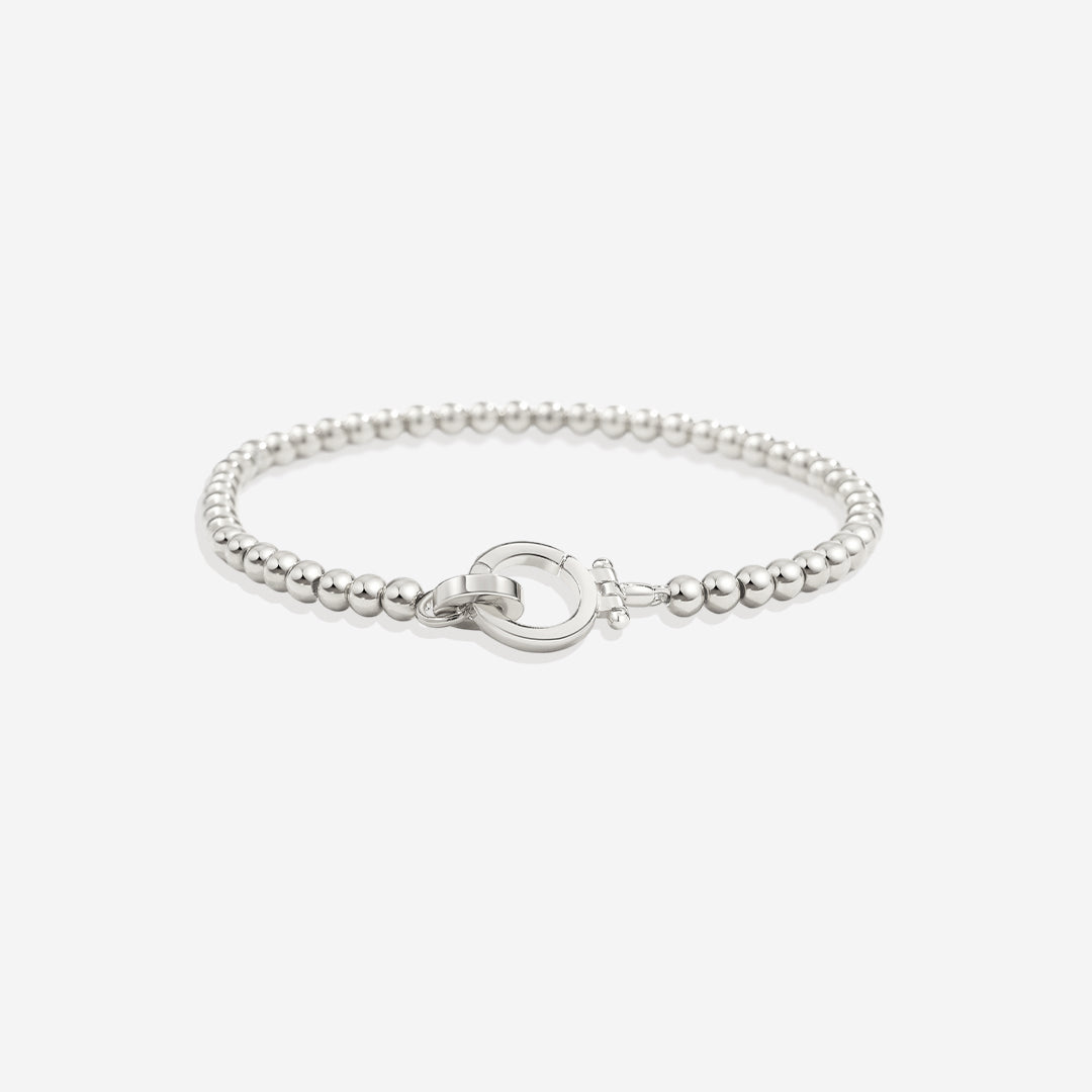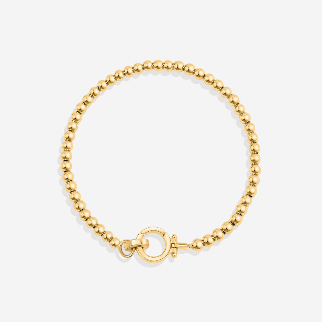Delicate gold beads meet a mint charm clasp for a playful twist. Style it solo or personalize with charms. Effortless, versatile, and perfect for stacking—your bracelet, your way.