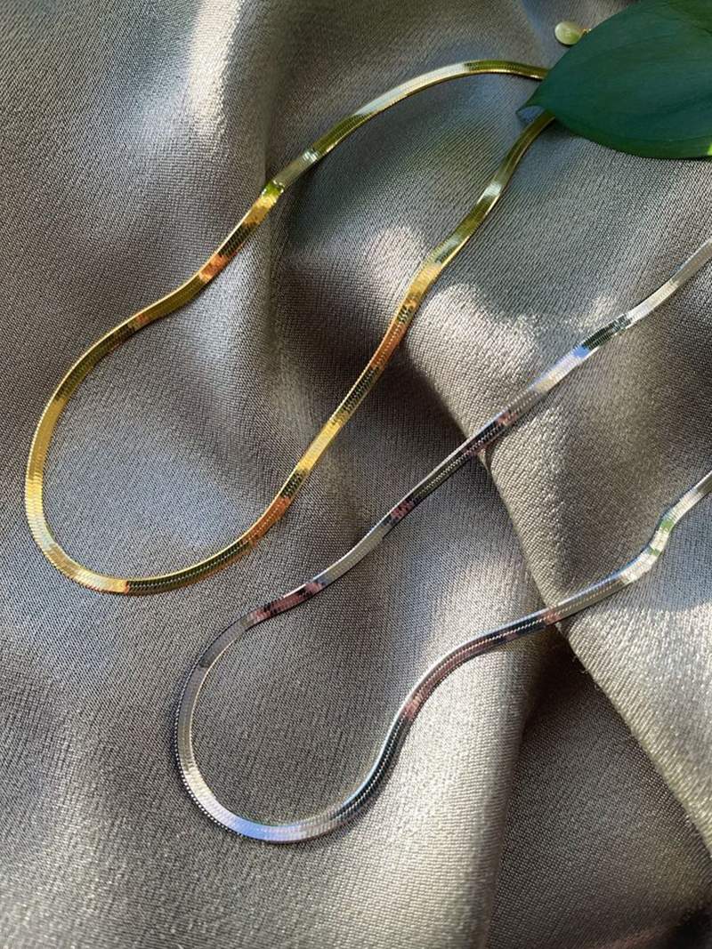 Our Sleek Necklace in gold stands out with its elegant, flat snake chain design, embodying a perfect blend of sophistication and a touch of extravagance. This striking piece features a finely detailed snake-inspired pattern, symbolizing transformation and elegance. Crafted from high-quality stainless steel and finished in radiant 14k gold plating, it offers lasting shine and exceptional durability. Perfect for making a bold statement, it adds a touch of mystique and refined allure to any ensemble — whether worn alone or layered. Make the Sleek Necklace yours today and elevate every look with a sophisticated, standout highlight.